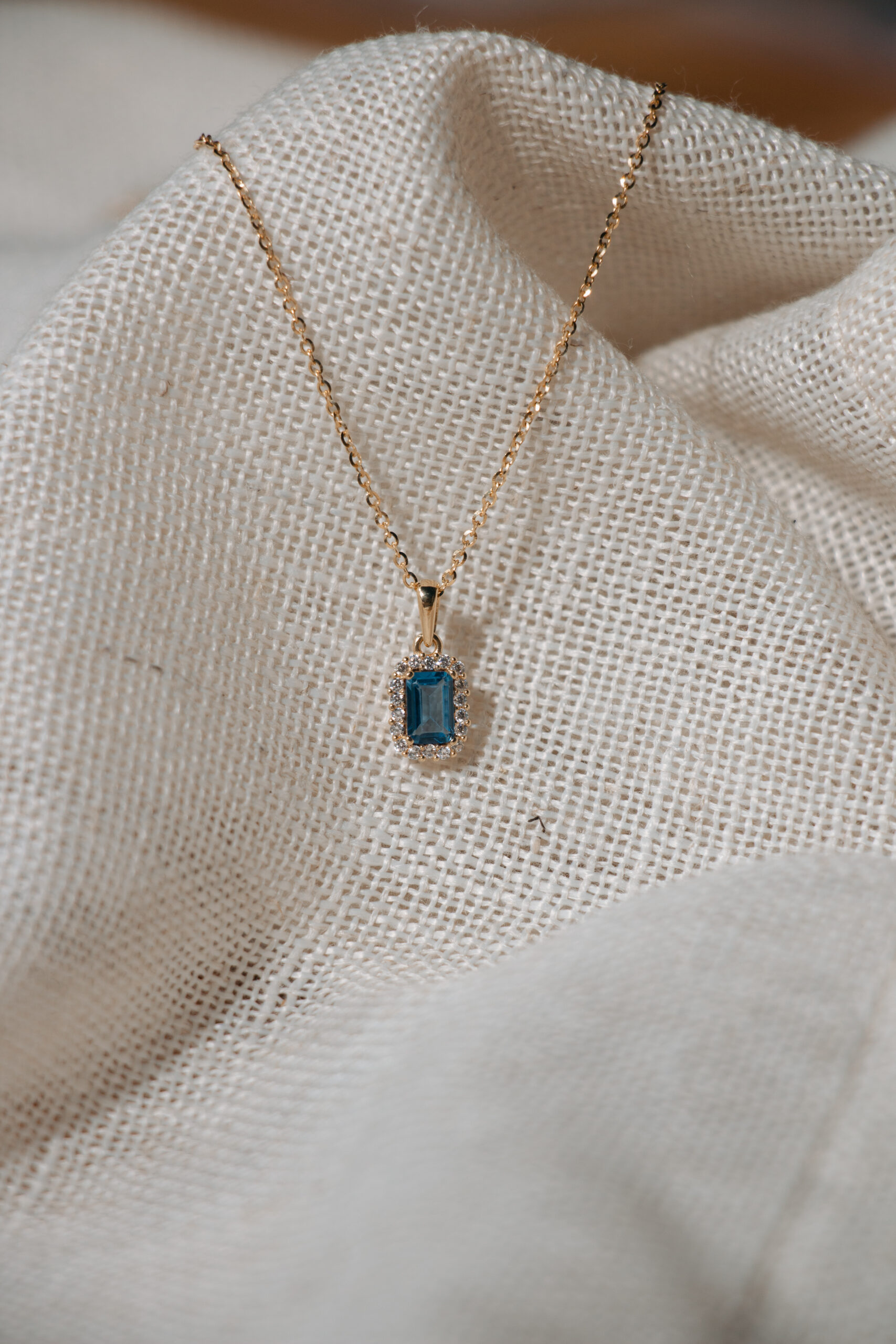 Cadena de oro amarillo de primera ley con colgante rectangular en oro amarillo de primera ley con cuarzo azul y circonitas.