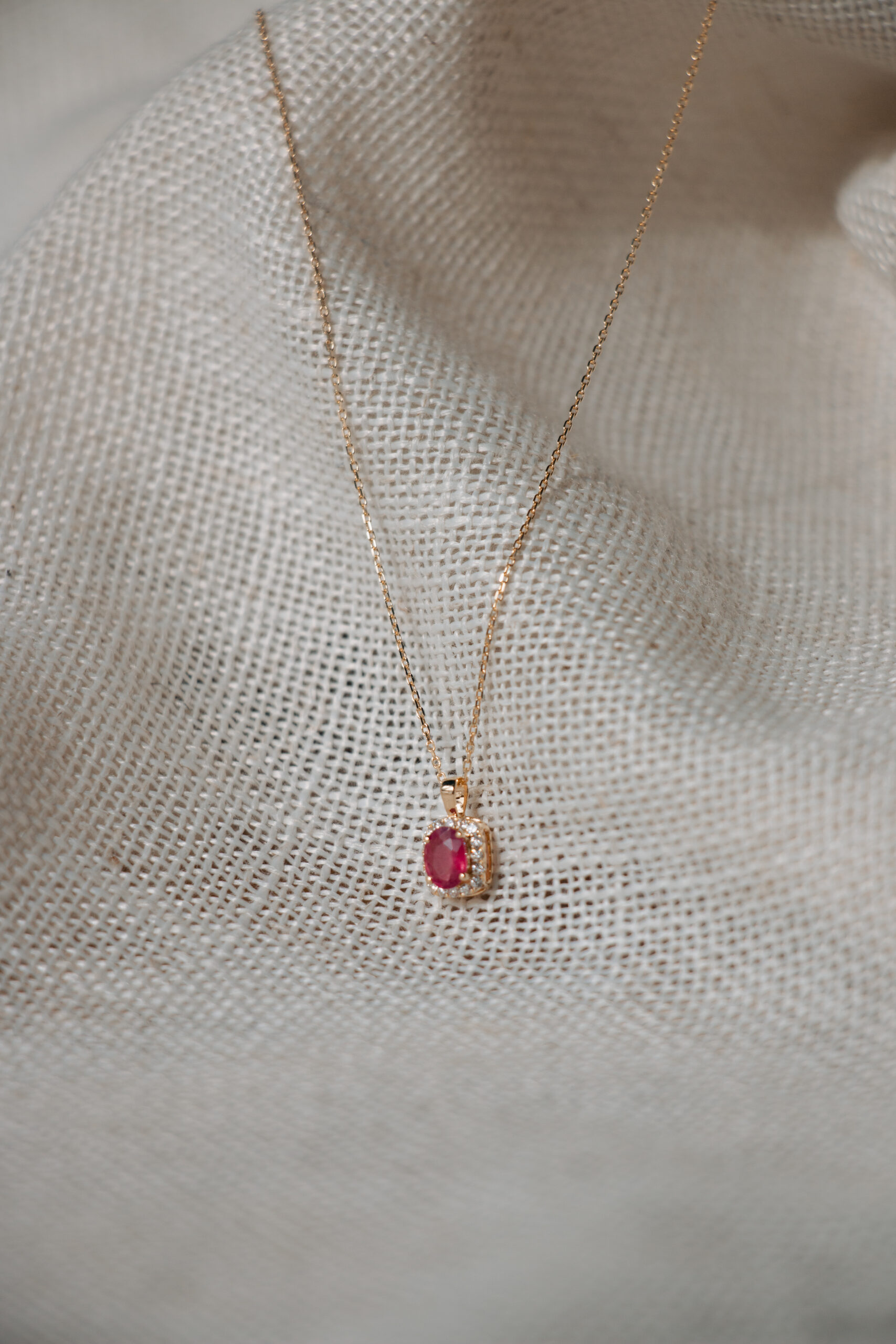Cadena de oro amarillo de primera ley con colgante ovalado en oro amarillo de primera ley con un rubi y orla de diamantes en talla brillante. Se entrega certificado de autenticidad.