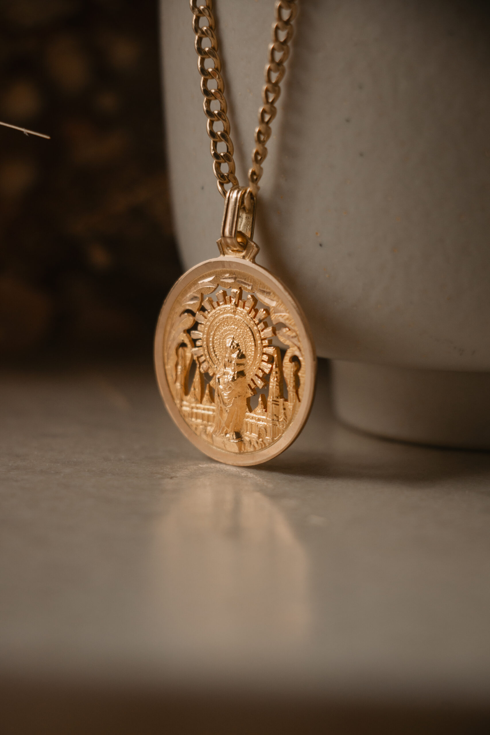 Medalla Virgen del Pilar calada en oro de primera ley de 18 kt, 24 mm de diametro.