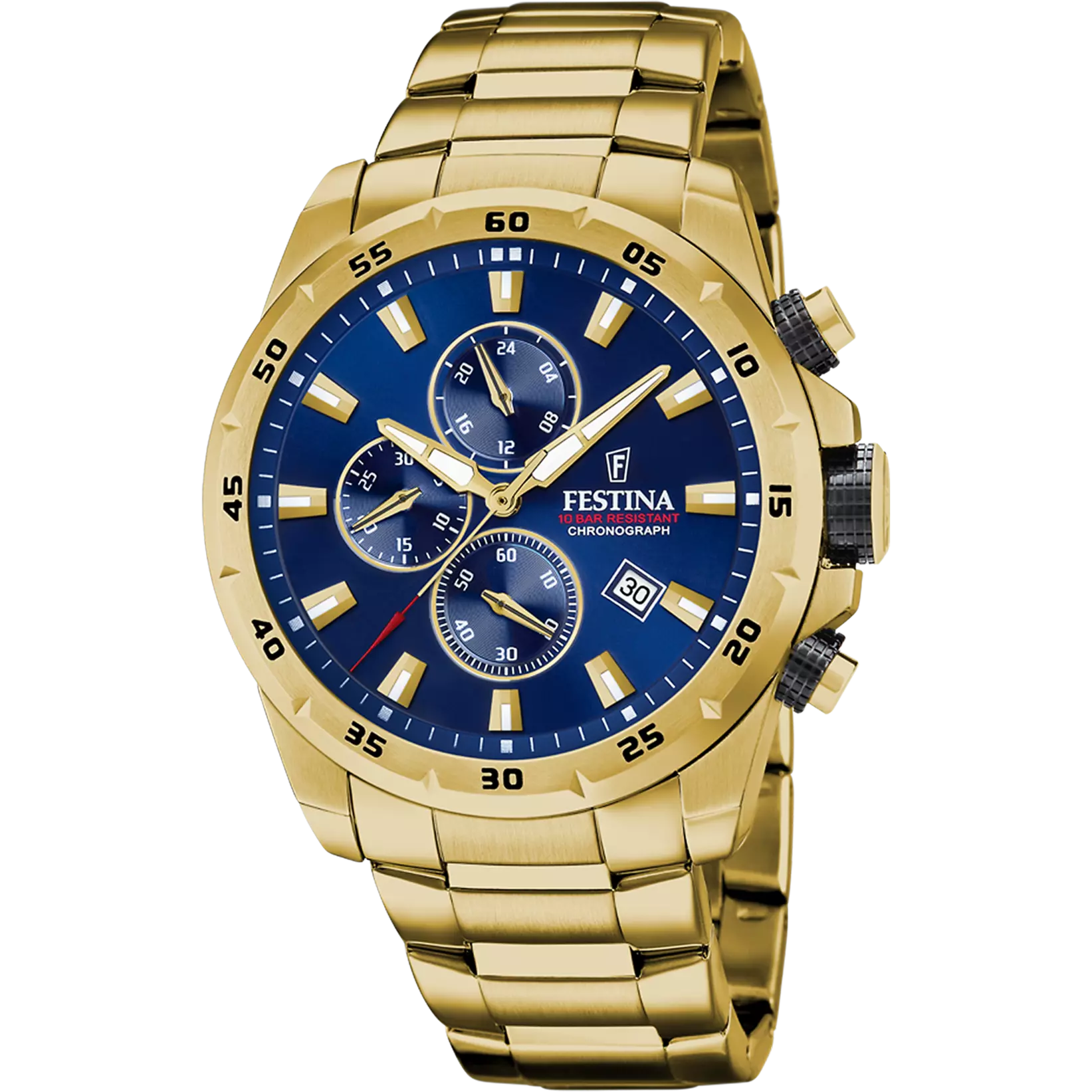 Reloj festina cronógrafo con pulsera metálica dorada de acero, esfera azul, cristal mineral y de acero inoxidable.