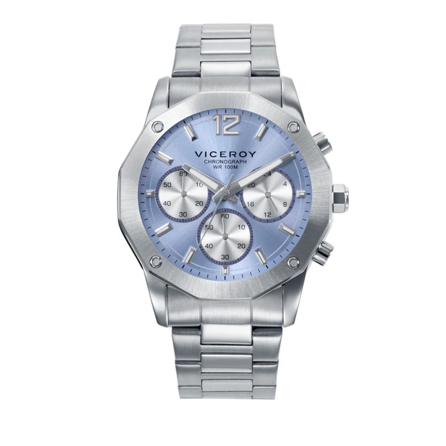 Un cronógrafo de alto rendimiento y estilo: este reloj de hombre con caja y brazalete de acero, resistente al agua hasta 10 ATM, combina funcionalidad y elegancia. Su esfera azul clara, con índices y agujas horarias en tono plata, crea un contraste limpio y sofisticado. Las contadoras en plata añaden un toque técnico y moderno. Con cristal mineral protector, es el accesorio perfecto para quienes buscan un reloj preciso y con diseño atemporal.