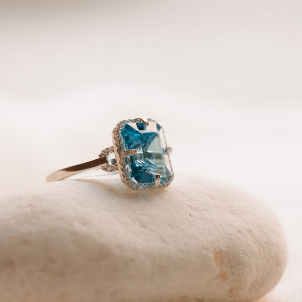 Sortija en oro blanco de primera ley con topacio azul octogonal de 5,170 cts y 46 diamantes de 0,180 cts. (Se entrega certificado de autenticidad) (Especificar talla en información adicional en el checkout)