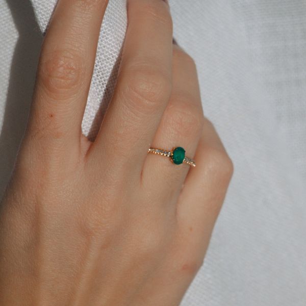 Solitario en oro amarillo de primera ley, 16 diamantes de 0,040 cts, 4 diamantes de 0.015 cts y 1 esmeralda oval de 0,60 cts. (Se entrega certificado de autenticidad) (Especificar talla en información adicional en el checkout)