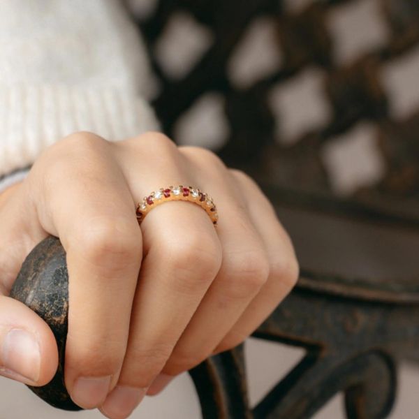 Sortija de oro de primera ley, con circonitas y rubis reconstituido.