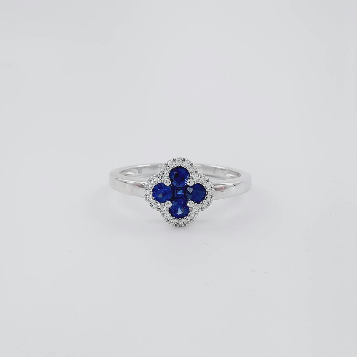 Sortija en oro blanco de primera ley en forma de flor con zafiro de 0,38 ct y diamantes en talla brillante de 0,048 ct. (Se entrega certificado de autenticidad) (Especificar talla en información adicional en el checkout) Si hay en stock, entrega en 7-10 días hábiles.